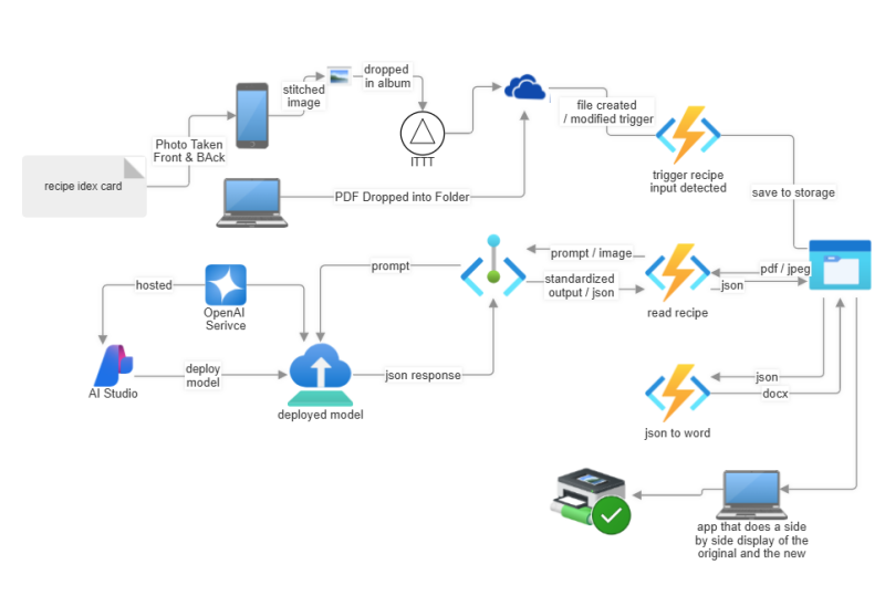My first draft of the envisioned solution. The two key pieces are an azure function that takes an image of a recipe and converts it to json. The 2nd is a json to word function. The rest is all the infrastructure around setting this up in an Azure production like flow. Getting photos from an album to onedrive or Azure may be the hardest part.