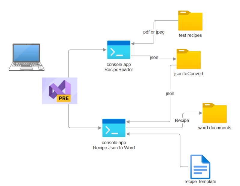 To prototype out the two key methods I developed two console apps. One that reads all the pdf and jpeg files in an input directory and calls the AI Engine to get the json for the recipe and save’s the json in a folder. Another console app that takes the json and reads a word document used as a template and merges in the json recipe information into the word document. In an enterprise environment a software reporting product would likely be used vs a custom app, but yeah it’s another learning opportunity.